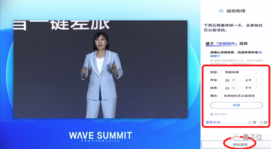 例如,百度集团副总裁、百度集团首席信息官李莹和同事在现场演示了一句话完成请假: