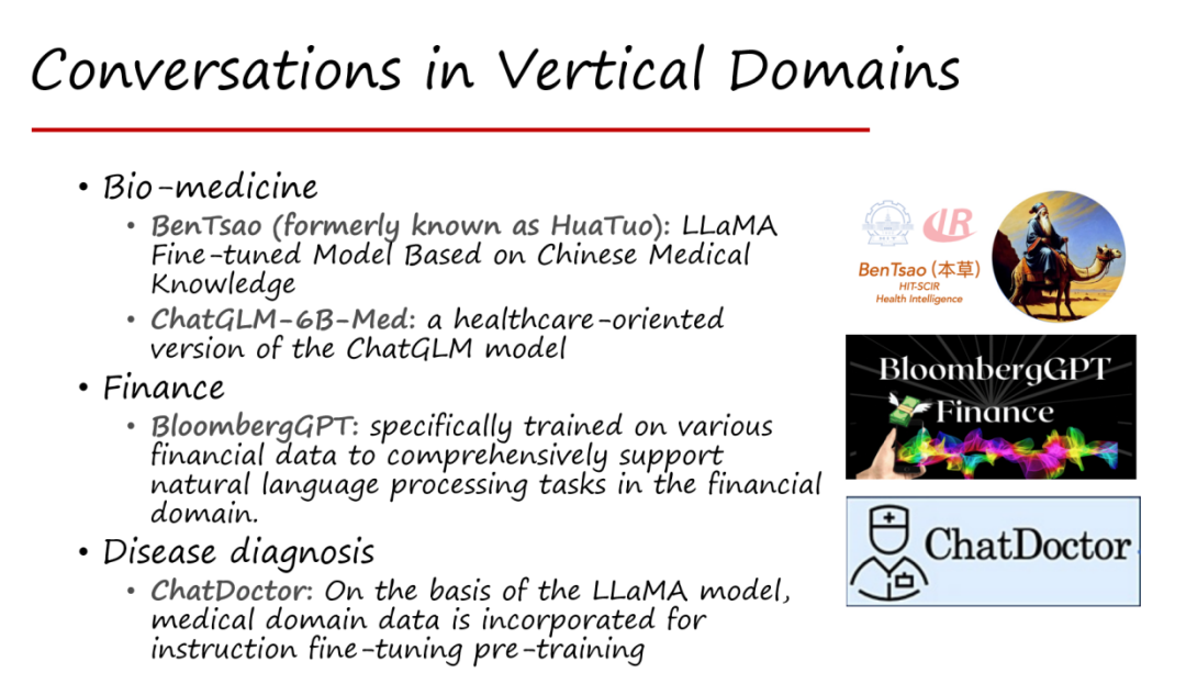 上述我所说的垂直领域,现在也涌现出来了非常多优秀的大模型,比如在生物医药领域有华佗大模型,现在叫本草大模型;还有基于 LLaMA 模型并结合医学知识进行训练的 ChatDoctor。此外,ChatGLM 是中文社区里比较大的开源大模型,在健康监护领域,也推出了自己的医疗版本。Bloomberg 对金融数据进行了一个微调推出了 BloombergGPT,这些都是在垂直领域比较著名的一些大模型。