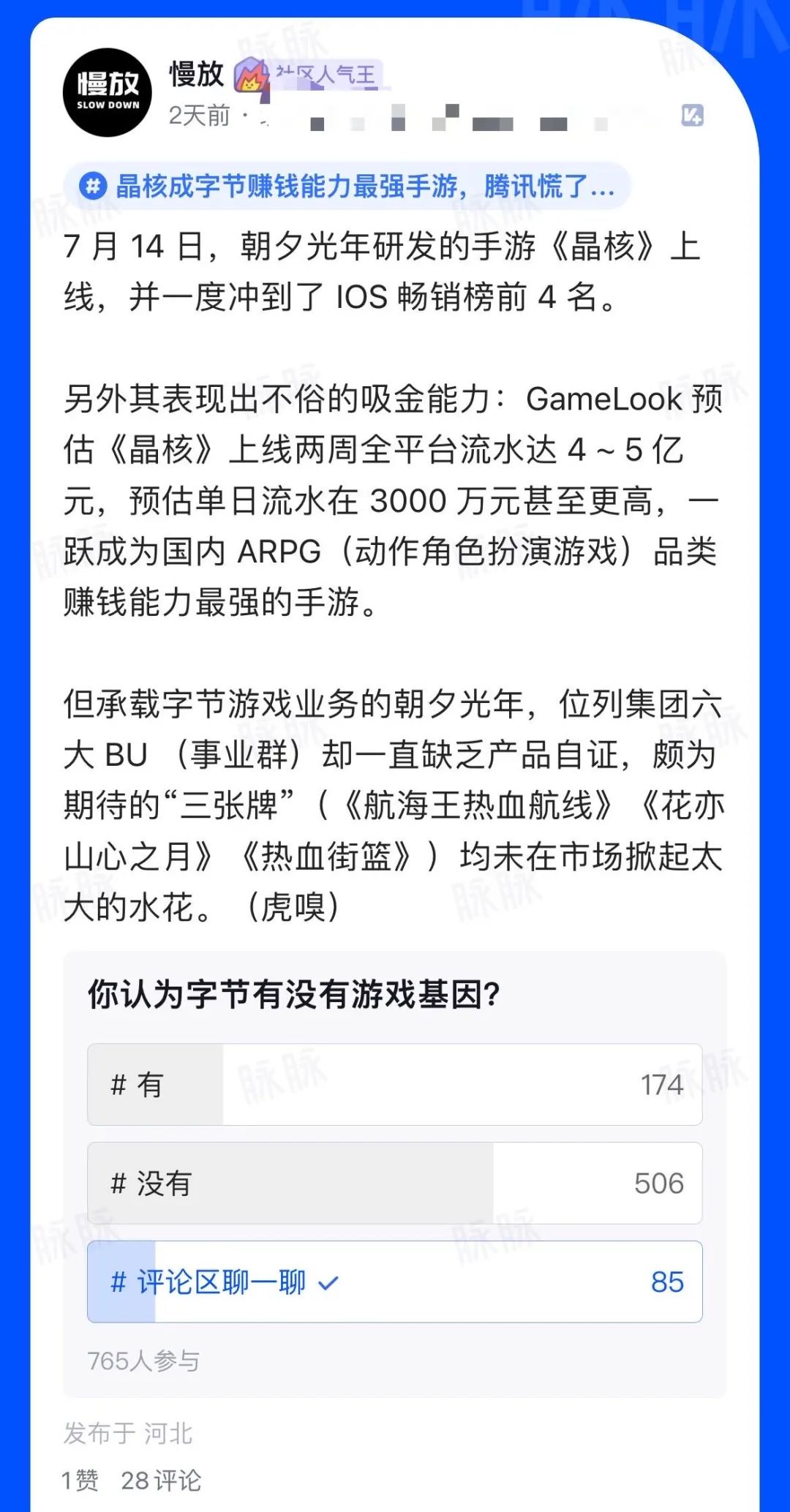 据慢放在脉脉创建“《晶核》成字节赚钱能力最强手游,腾讯慌了没”话题显示,超过 65% 的用户表示字节并没有游戏基因。