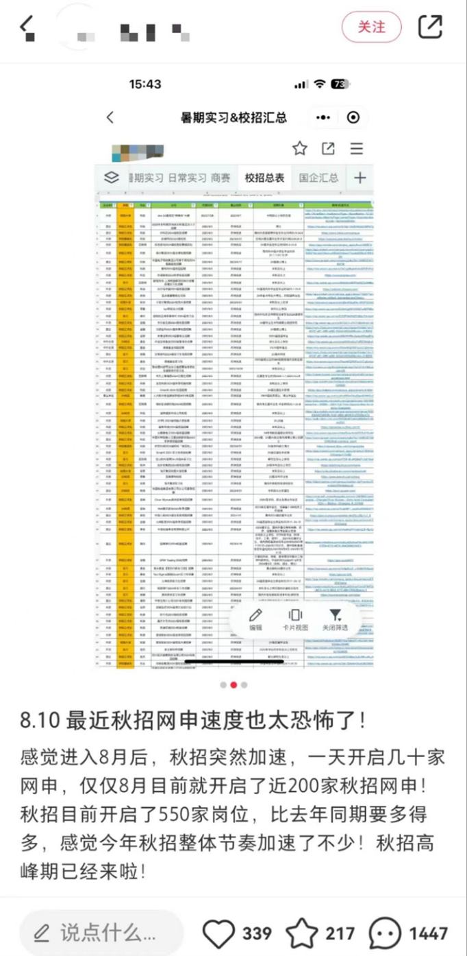 有网友在整理秋招信息时发现,进入 8 月后秋招突然加速,一天开启几十家网申,仅 8 月目前就开启了近 200 家秋招网申。