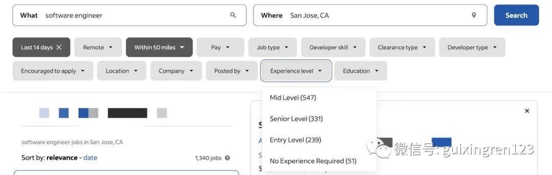 打开著名招聘网站 Indeed,在求职岗位输入“Software Engineer”,条件设定为“过去 14 天里、以圣何塞为中心的 50 英里范围内”,可看到共发布包含 Full-time,Contract 等在内 1343 个职位。其中 Mid 和 Senior level 占了 65%,Entry level 只有 242 个。
