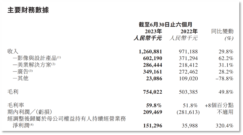 股价回升得益于美图公布的惊人业绩。据 2023 年度中期业绩报告,该公司实现总收入 12.61 亿元,同比增长 29.8%。更亮眼是利润,据报告,该公司归母净利润 1.51 亿元,同比增长 320.4%。